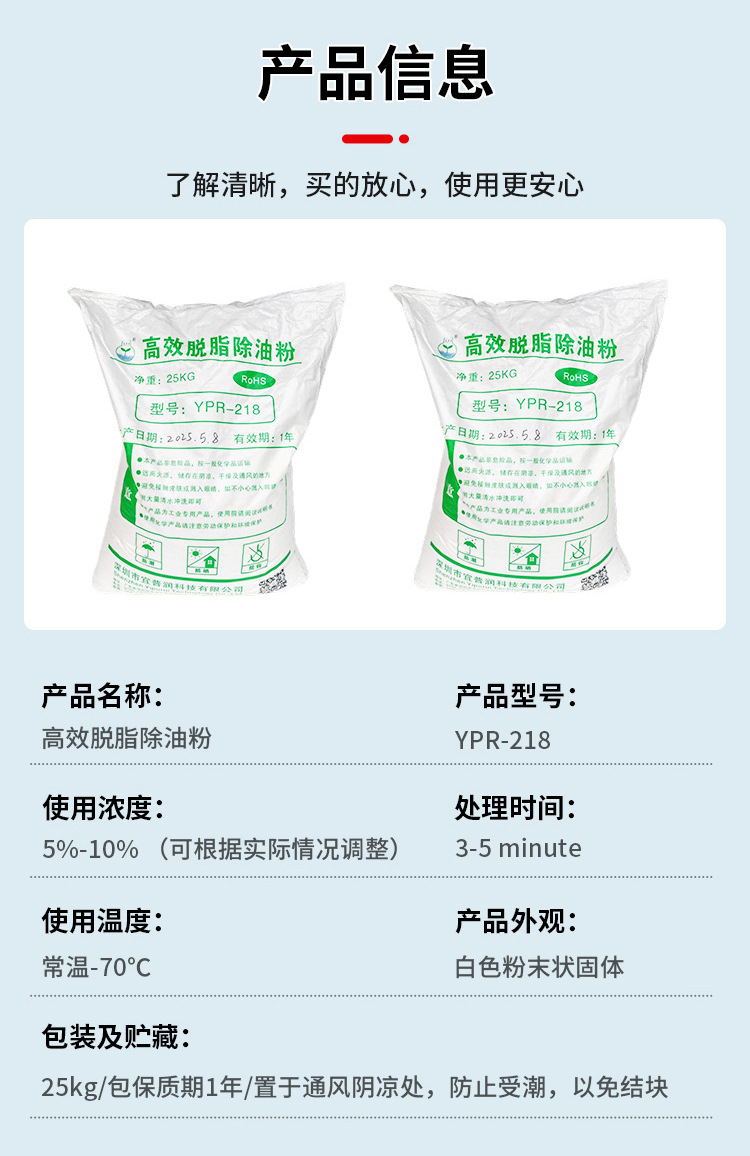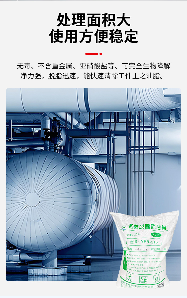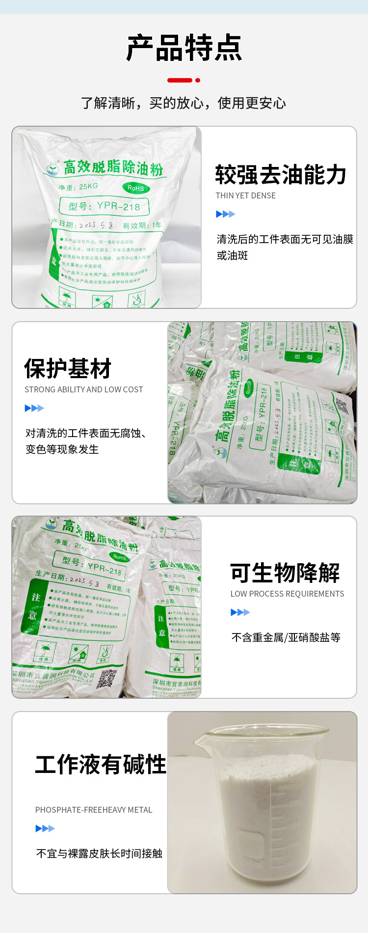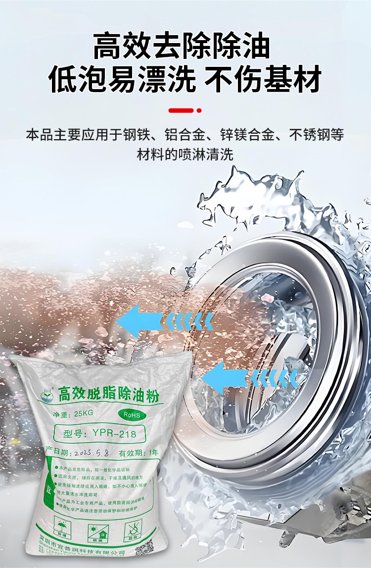 除油粉采用多种优质表面活性剂、去污剂、渗透剂、助洗剂等精制而成的低泡除油脱脂剂,具有良好的润湿,增溶和乳化等能力,有超强的去油能力。清洗后的工件表面无可见油膜或油斑。本品主要应用于钢铁、铝合金,合金:镁合金等合金材料的清洗,对工件无损伤现象。