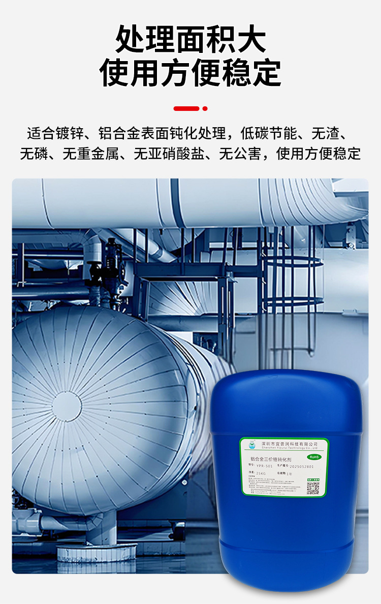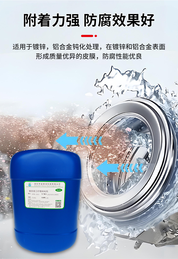 本三价铬钝化剂专为铝及合金表面防护处理设计,以三价铬盐为核心成分,通过化学成膜反应在金属表面形成致密、均匀的钝化膜。该钝化膜具备优异的耐腐蚀性、良好的装饰性和耐磨性,可显著提升金属工件的抗蚀性能与使用寿命,适用于铝及铝合金、锌合金、镀锌件等多种金属材质的钝化处理,广泛应用于汽车、电子、五金等行业。