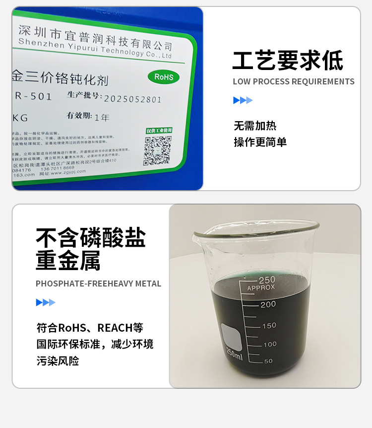1、环保安全:不含六价铬、重金属等有害物质,符合ROHS、REACH等国际环保标准,减少环境污染风险。