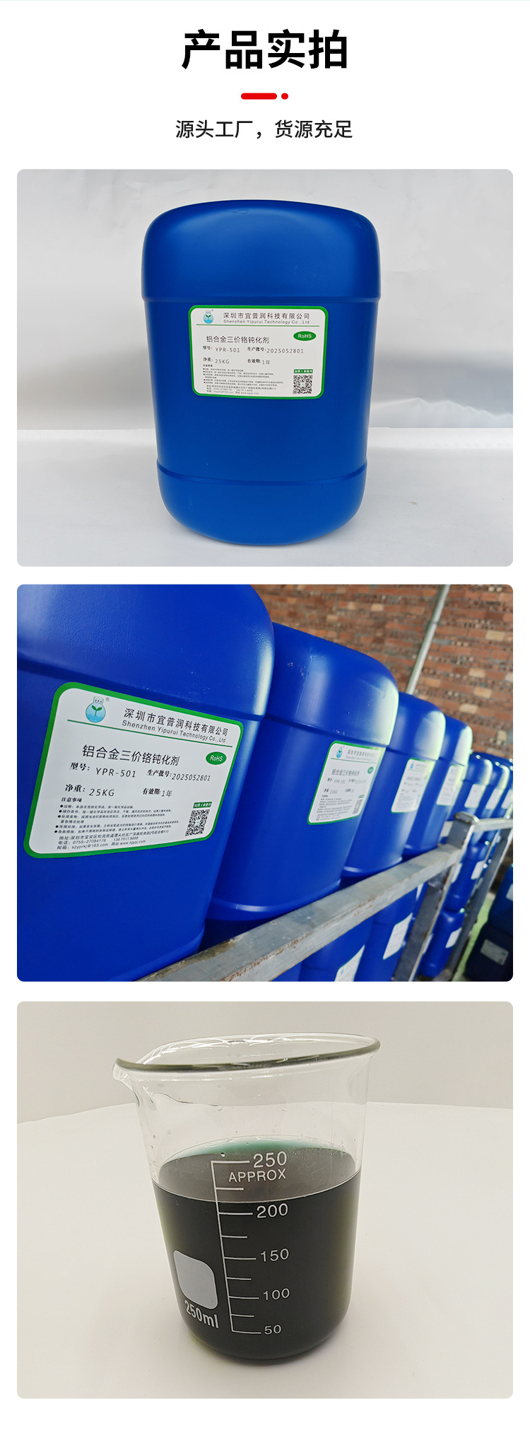 - 缓慢加入三价铬钝化剂原液,按每升水添加50-80ml钝化剂的比例配制(具体比例根据金属材质和工艺要求调整)。