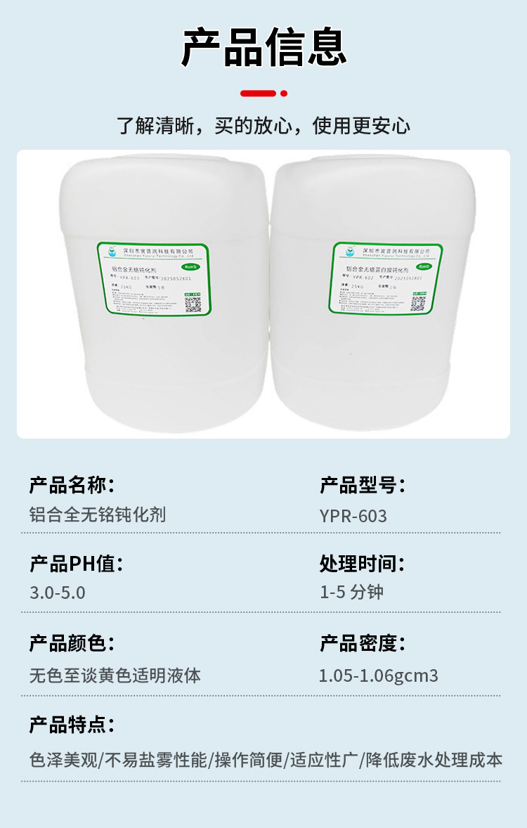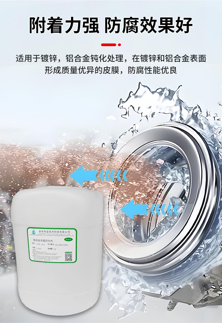 无铬钝化剂是一种环保型表面处理剂,不含铬等有害重金属,符合国内外环保法规要求(如ROHS指令等)。它通过在金属表面形成层致密、均匀的钝化膜,显著提高金属的耐腐蚀性、耐磨性和装饰性,广泛应用于铝合金、锌合金、镁合金及钢铁等金属材料的表面处理。