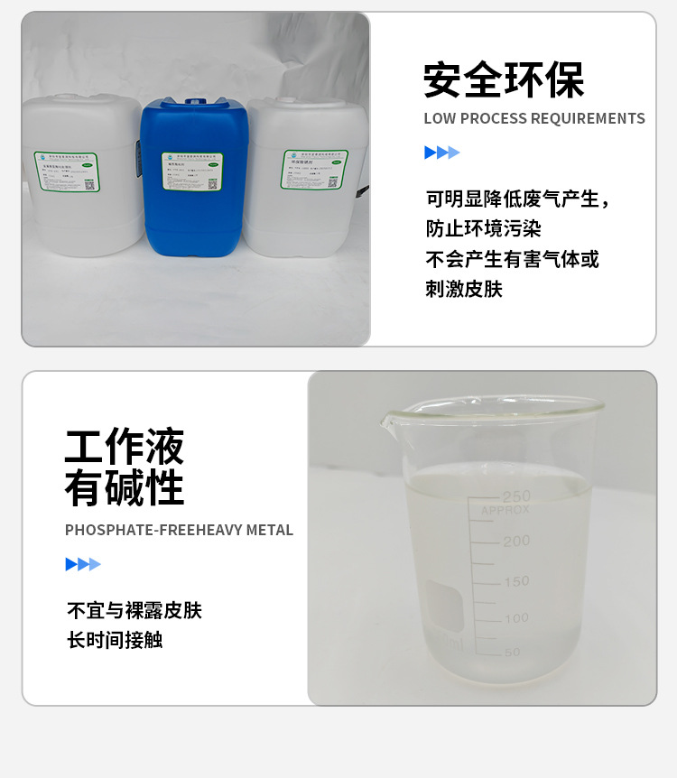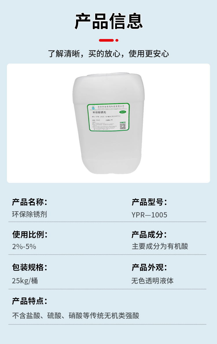 环保型高效除锈剂,不含盐酸、硫酸、硝酸等传统无机类强酸,通过有机酸的螯合作用去除工件表面的氧化物和碳粉,同时去除钢铁表面的锈、焊渣、氧化皮。