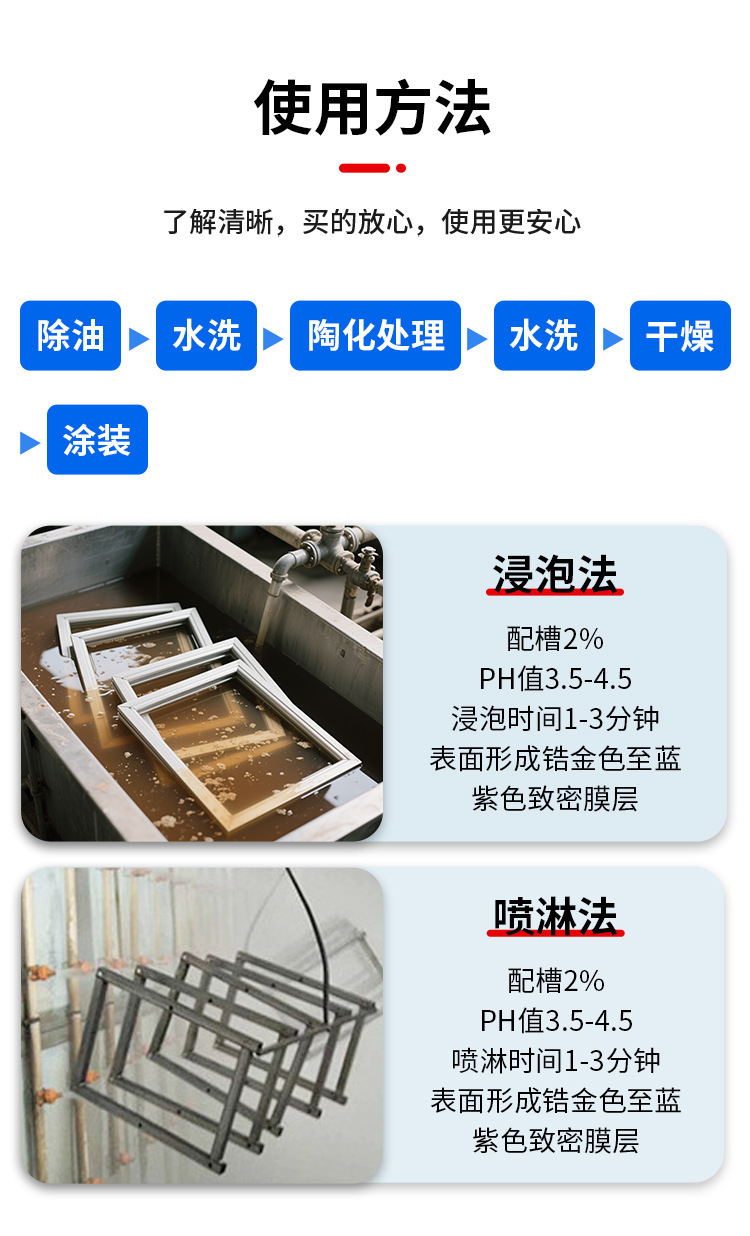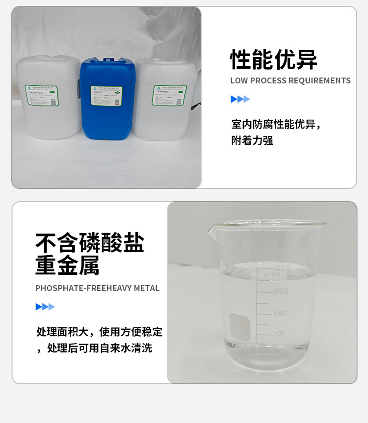 高时效,室内防腐性能优异,附着力强,低碳节能、无渣、无磷、无氟、无亚硝酸盐,更优越的环保性能。处理面积大,使用方便稳定,处理后可用自来水清洗。