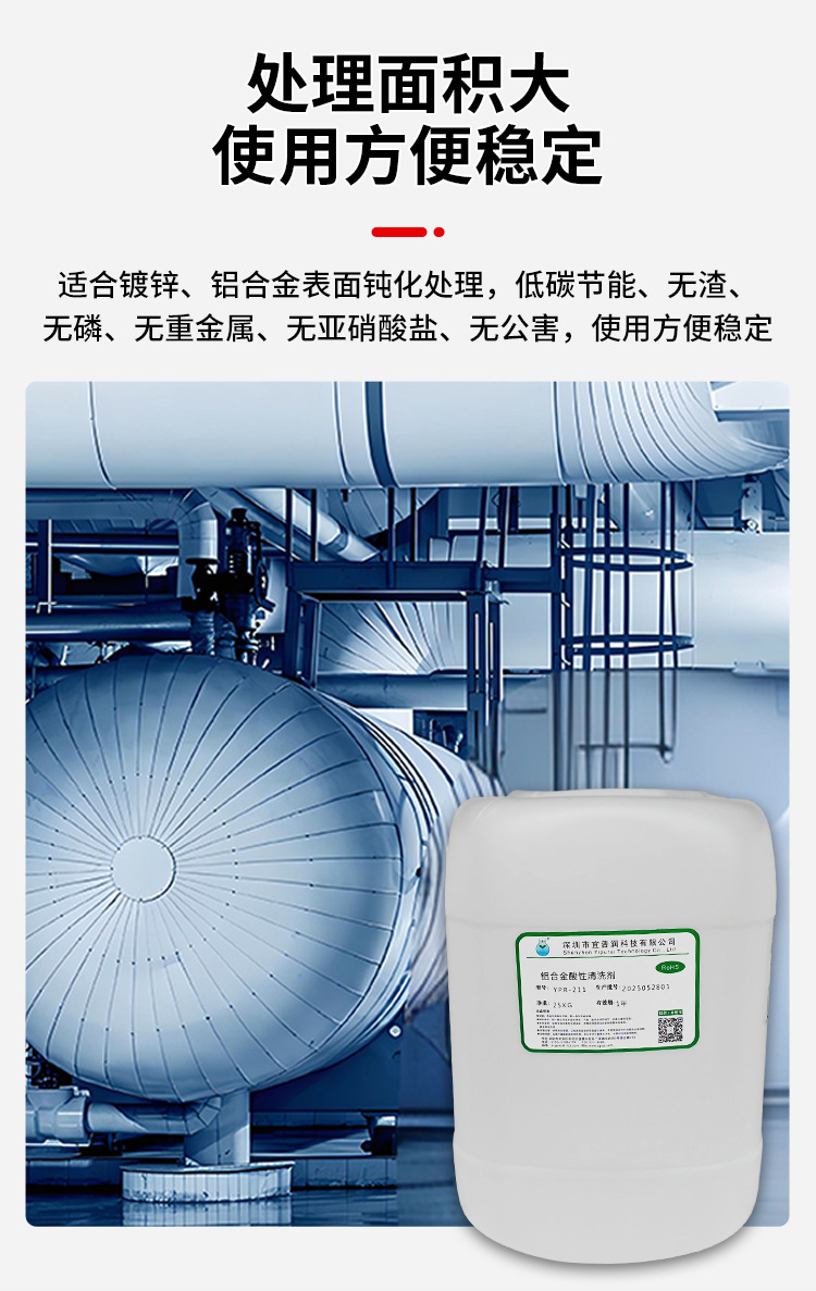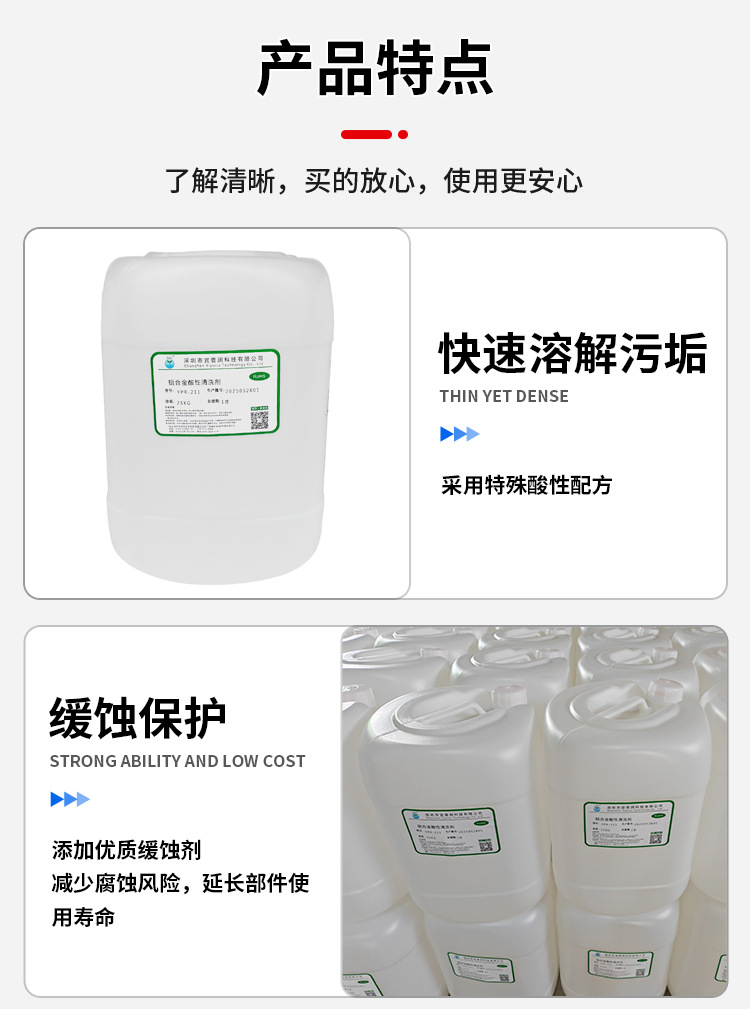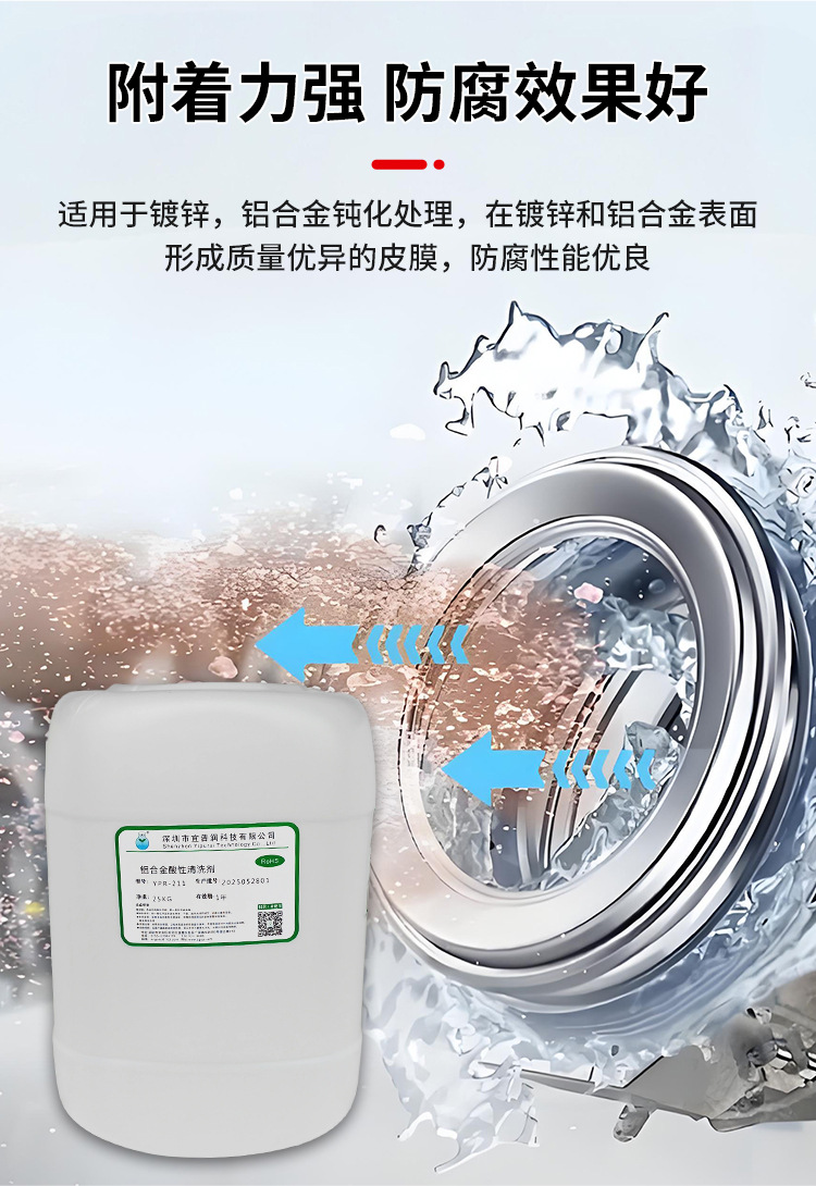 1、高效清洁:强力溶解铝合金表面各类油污、氧化物及锈迹,清洗速度快,去污彻底。